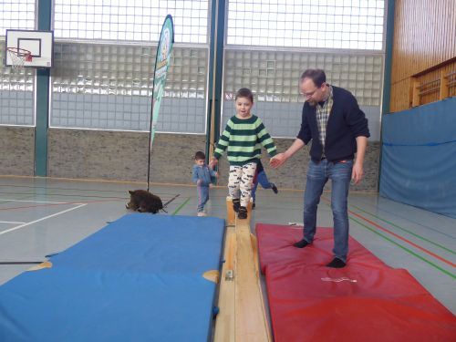 Es ist ein durchaus anspruchsvoller, aber leistbarer Bewegungsparcours, den die rund dreißig Kinder an diesem Nachmittag in der Turnhalle der Grundschule Didrik-Pining auf spielerische Weise absolvieren müssen. Das Ziel der drei- bis sechsjährigen Kinder ist der Erwerb des Minisportabzeichens. Der Landessportbund Niedersachsen hat sich das Konzept für diese Art Sportabzeichen für die ganz Kleinen überlegt. „Die einzelnen Sportübungen sind eingebunden in eine Bewegungsgeschichte“ erklärt die Kreissportbund-Engagierte Regina Hoffmann. Die Kinder begleiten Hase Hoppel und Igel Bürste auf ihrem Weg durch den Eichenwald zu Frau Eule. Als Stofftiere sind Hase, Igel, Eule und Wildschwein auch im Sportparcours präsent. So wird in der Fantasie die Sportbank zum umgestürzten Baumstamm, über den balanciert werden muss, um die andere Seite des tiefen Grabens zu erreichen.