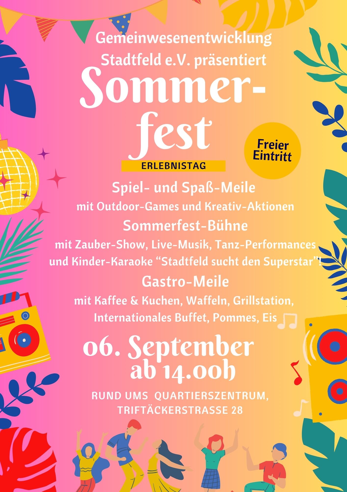 HERZLICH WILLKOMMEN, liebe Nachbarinnen und Nachbarn, liebe Gäste von Nah und Fern! Die Sommerfest-Einladung gibt einen kleinen Ausblick auf die Angebote zwischen Gastro-, Spiel- und Event-Meile:
