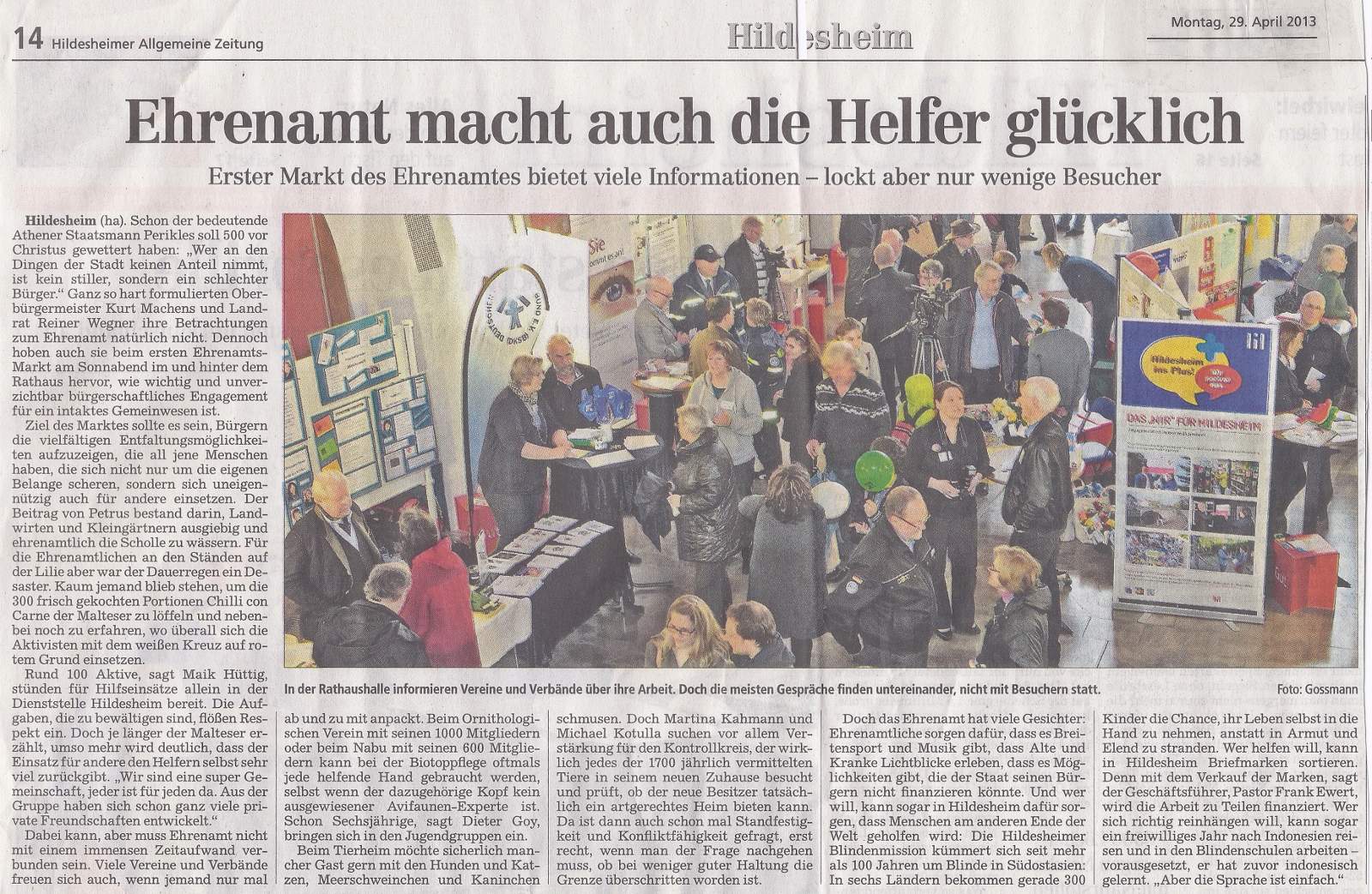 Am Samstag den 27.09.2013 fand von 11 bis 16 Uhr der 1. Markt für Ehrenamt und freiwilliges Engagement in Hildesheim statt. Organisiert war dieser Markt, im und um das Hildesheimer Rathaus herum, vom Freiwilligen-Zentrum Bonus und der BürgerStiftung Hildesheim. Etwa 20 verschiedene soziale Einrichtungen und Initiativen stellten ihr Angebot und vor allem die damit verbundenen Möglichkeiten zur Mitarbeit für Interessierte Hildesheimer Bürgerinnen und Bürger vor. Da durften wir von der Gemeinwesenentwicklung Stadtfeld e.V. natürlich nicht fehlen!