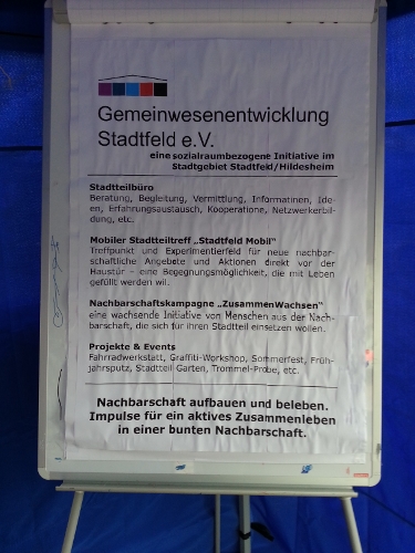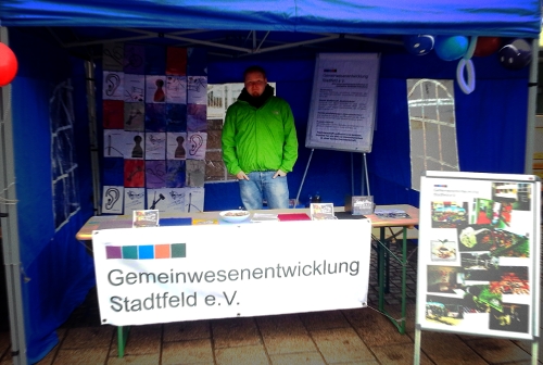 Schließlich bietet unser Verein im Stadtfeld gute Möglichkeiten um kreative Ideen in die Tat umzusetzen oder sich an unseren bestehenden Projekten, wie z.B. dem Sommerfest, aktiv zu beteiligen.Sebastian Denecke - seit September 2012 Berufspraktikant im Anerkennungsjahr bei uns im Stadtfeld – betreute während der Aktion unseren Stand und freute sich über regen Besuch: „Da hat sich die Vorbereitung doch gelohnt. Das Wetter spielt nicht ganz mit, aber dennoch sind viele Menschen gekommen, um sich über das Ehrenamt in Hildesheim bzw. auch direkt bei uns im Stadtfeld zu erkundigen. Es wäre doch schön, wenn sich durch die Aktion heute das eine oder andere Angebot für und vor allen mit den Menschen im Stadtfeld ergibt.“ Außerdem mit dabei waren unsere Nachbarn aus der Triftäckerstraße 37. Katharina Thielemann betreute den Stand für die Hausaufgabenhilfe Etui.