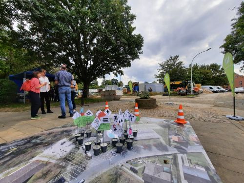 So und ähnlich begannen viele der Gespräche im Verlaufe des Aktionstags im Stadtfeld für das neue Quartierszentrum. An dem Samstag, 11.09.2021 von 13:00 bis 16:00 Uhr verwandelte sich die Straßenecke gegenüber des Stadtteilbüros Stadtfeld in der Triftäckerstraße in einen bunten Markt der Möglichkeiten. Gemeinsam mit dem Quartiersmanagement Stadtfeld hatte die Stadt Hildesheim zu dem Aktionstag eingeladen, um mit den Bürgerinnen und Bürgern ins Gespräch zu kommen.