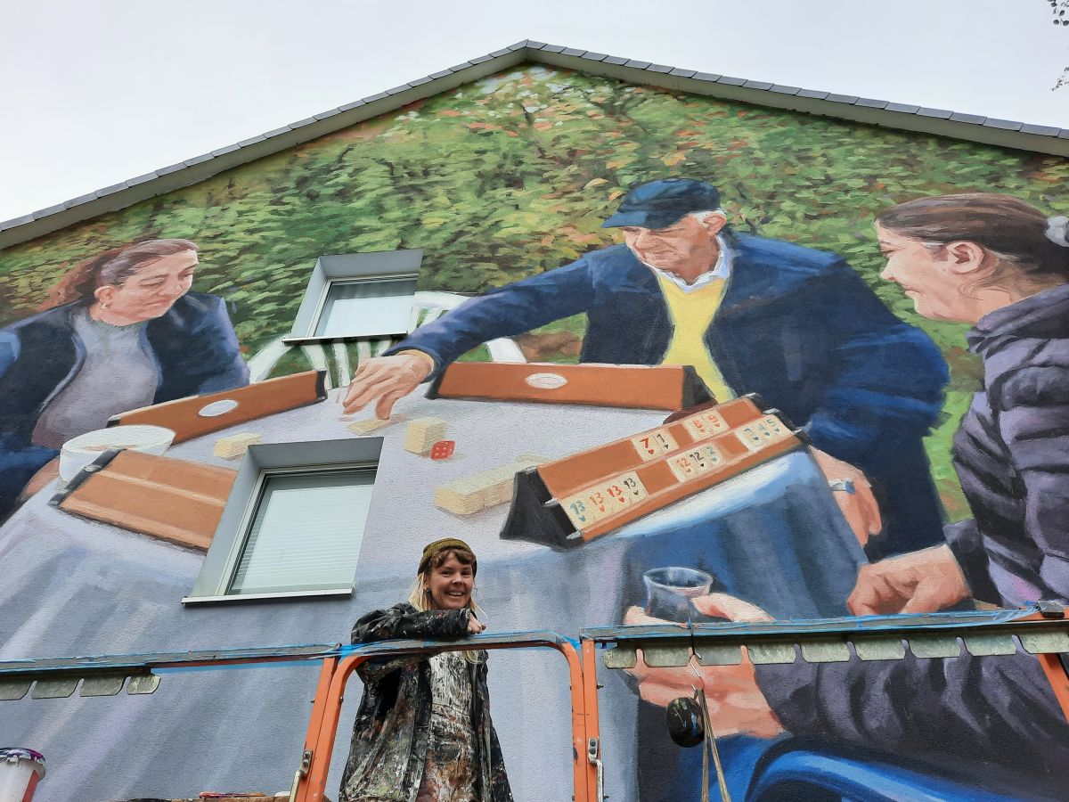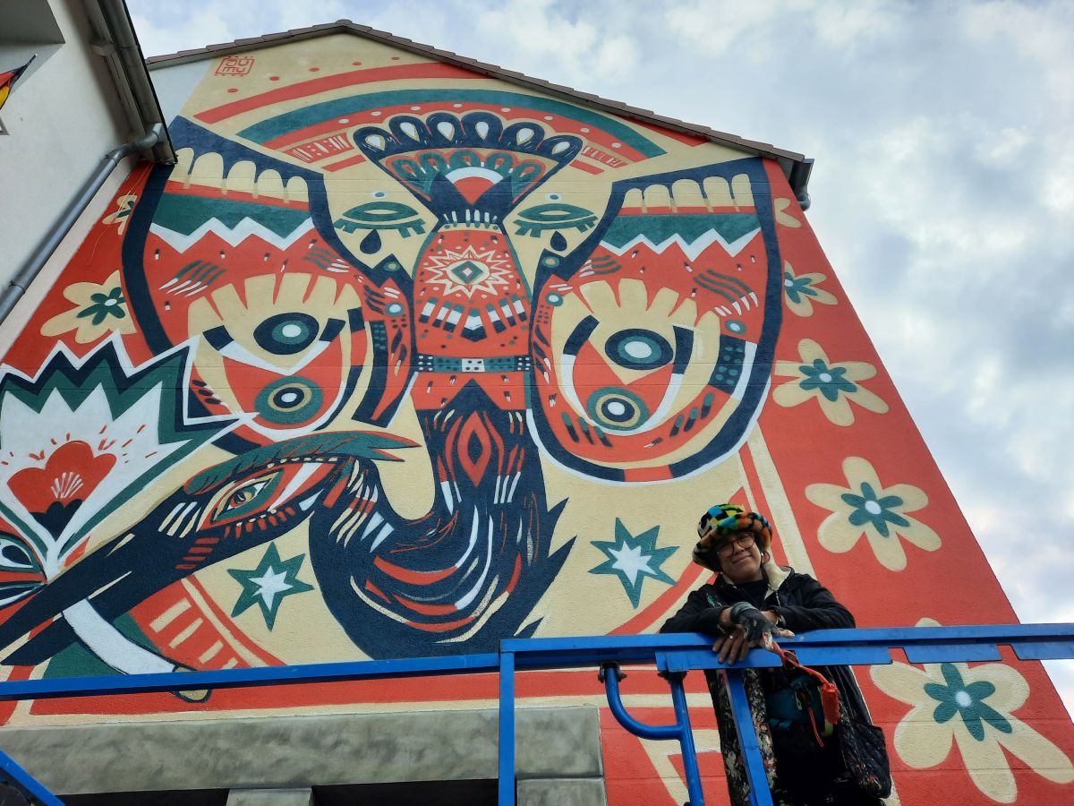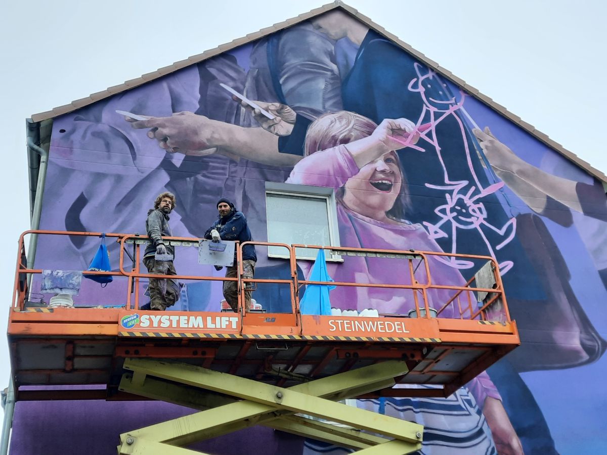 Nicht weit entfernt arbeitet JuMu Monster an ihrem Vogel-Mural. Auch JuMu behält beim Malen ihres farbenfrohen Motives die gute Laune: „Der Heizlüfter hält mich warm!“ lacht die Künstlerin mit lateinamerikanischen Wurzeln und trotzt dem winterlichen Wetter. Tatsächlich läuft ein großes Gebläse im Hintergrund, das die Farbe praktisch gleich beim Malen trocknet.