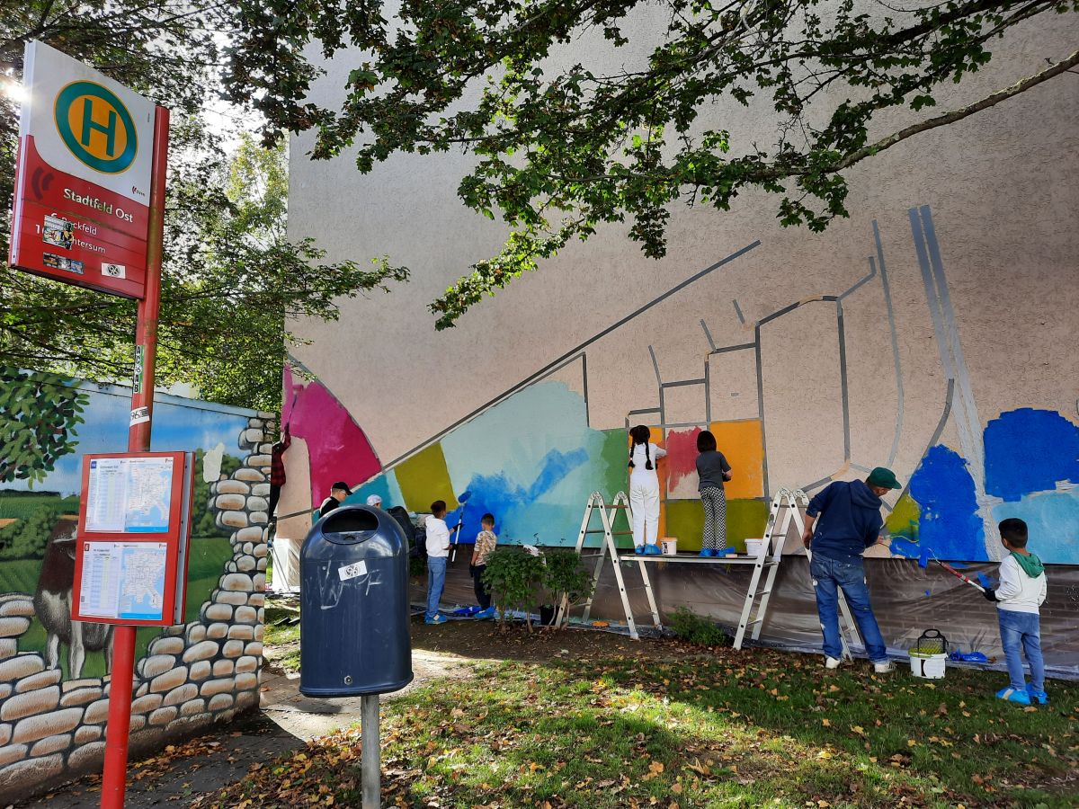 Den letzten Schliff gibt der Künstler dem Bild dann zwei Tage später. Nun tauchen die Silhouetten der Kinder als bunte Schatten in dem Kunstwerk auf. Als letztes erstrahlt das große Logo „Stadtfeld zeigt Gesicht“ über allem.