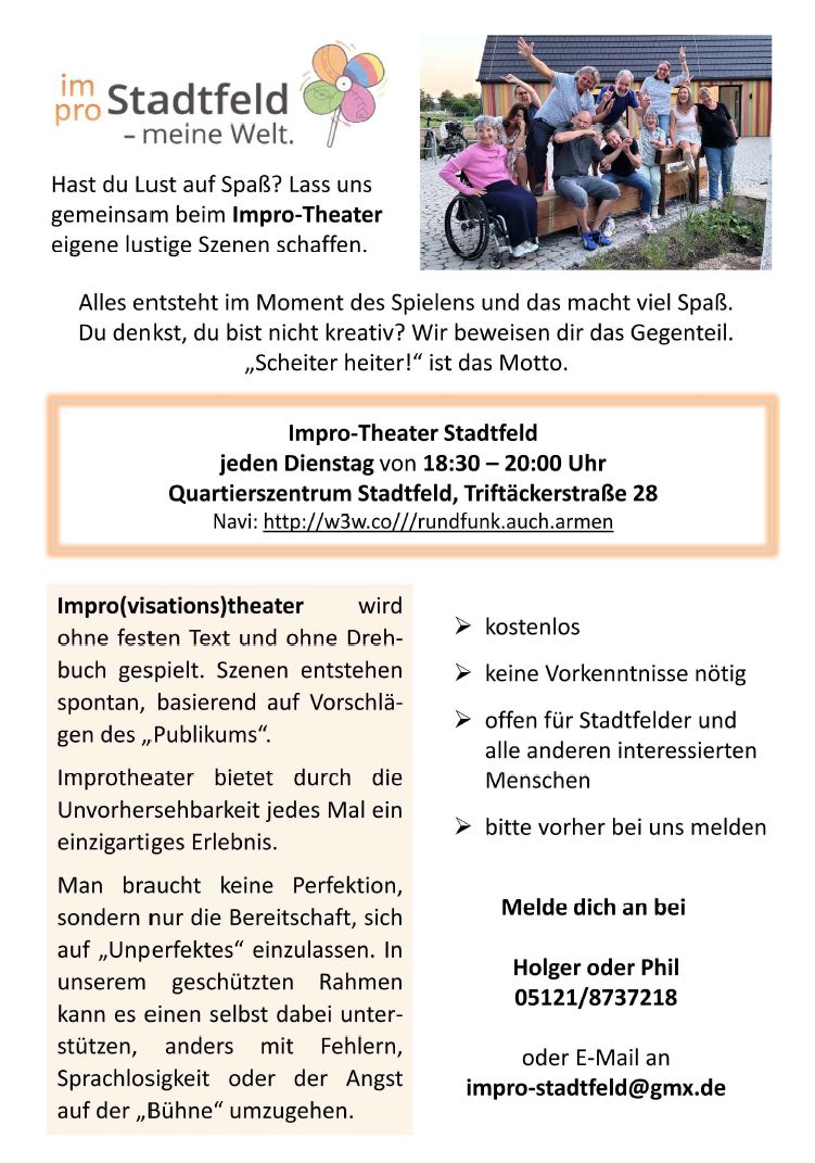| Offene Impro-Theater-Gruppe "impro Stadtfeld" jeden Dienstag von 18:30 bis 20:00 Uhr im Quartierszentrum Stadtfeld Anmeldung erforderlich unter (05121) 8737218 oder unter |